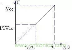 不同的Δθ,有不同的直流分量Vd。Δθ與V的關(guān)系可用圖4來描述。從圖中可知,兩者呈簡單線形關(guān)系:Ud = Kd *Δθ (2)Kd 為鑒相靈敏度