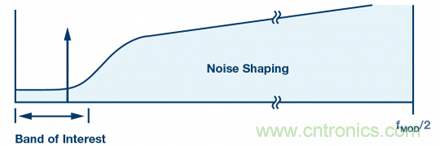 Σ-Δ型調(diào)制器通過(guò)對(duì)反饋回路(量化器輸出)調(diào)制,進(jìn)而實(shí)現(xiàn)對(duì)量化噪聲整形,,從而降低目標(biāo)頻段內(nèi)的噪聲,但代價(jià)是增加帶外噪聲,如圖3所示。