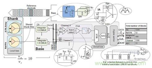 探針架構(gòu)設(shè)計(圖5)中的信號流,通過一條共享柄線從8個多路復(fù)用PA陣列的輸出流向底座。然后,該信號進入探針底座中的積分器,積分器的輸出通過8個標(biāo)記為Vo的采樣保持電路進行解復(fù)用。接下來,8個單獨的Vo中的每一個都進入自己的信道模塊,它們對信號進行放大和濾波,使得輸出僅有感興趣的頻帶。接下來,所有20個通道經(jīng)過多路復(fù)用并由10位逐次逼近寄存器式(SAR)模數(shù)轉(zhuǎn)換器(ADC)進行數(shù)字化,并發(fā)送至為ADC和多路復(fù)用/多路解復(fù)用器(MUX/DEMUX)提供時鐘的數(shù)字控制模塊。在此,所有ADC的并行輸出經(jīng)串行化后僅有6條數(shù)據(jù)線。