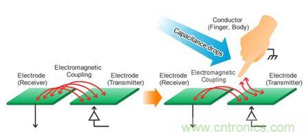 其次,在電容互感方式下,可以提高觸摸按鍵的防水性能,從而可以設(shè)計更加復(fù)雜的應(yīng)用于潮濕表面的觸摸按鍵界面。