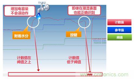 由于潮濕的表面,會增加電容量。即使在潮濕的表面,也能正確識別按鍵,從而避免了電容自感方式下的觸摸誤動作。