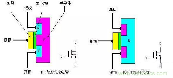 功率MOSFET的內(nèi)部結(jié)構(gòu)和電氣符號如圖所示,它可分為 NPN型和PNP型。NPN型通常稱為N溝道型,PNP型通常稱P溝道型。由圖1可看出,對于N溝道型的場效應管其源極和漏極接在N型半導體上,同樣對于P 溝道的場效應管其源極和漏極則接在P型半導體上。我們知道一般三極管是由輸入的電流控制輸出的電流。但對于場效應管,其輸出電流是由輸入的電壓(或稱場電壓)控制,可以認為輸入電流極小或沒有輸入電流,這使得該器件有很高的輸入阻抗,同時這也是我們稱之為場效應管的原因。