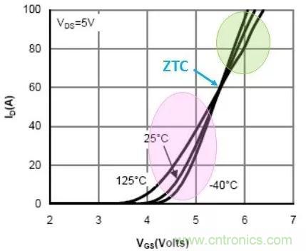 器件的失效處取決于脈沖時間、散熱條件和功率MOSFET單元平衡性能。通常,ZTC對應的電流越大,對應的VGS越大,就越容易發(fā)生熱不穩(wěn)定性問題。而且ZTC直接和跨導相關,跨導增加,ZTC點向更高的VGS點移動。