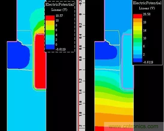 圖4:完全導通(左)和線性區(qū)的電勢分布圖