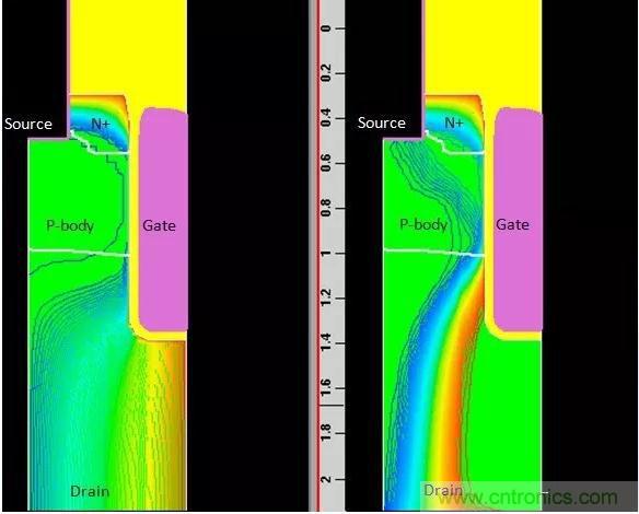 從電勢分布圖,功率MOSFET完全導通時,VDS的壓降低,耗盡層完全消失;功率MOSFET在線性區(qū)工作時,VDS的電壓比較高,耗盡層仍然存在,此時由于在EPI耗盡層產(chǎn)生電子-空穴對,空穴也會產(chǎn)生電流,參入電流的導通。