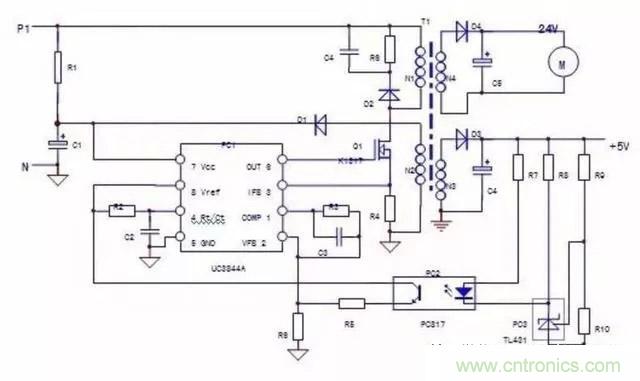 c.代換PC2,PC3無效,故障可能為開關管低效,或者UC3844內部輸出電路低效,代換優(yōu)質開關管或者UC3844芯片。
