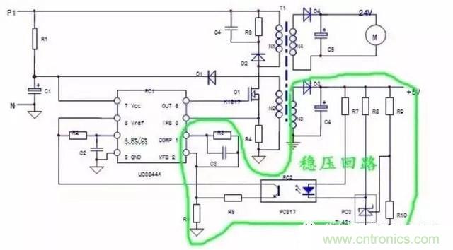 B.對UC3844單獨上電,短接PC2輸入側,若電路起振,說明故障在PC2輸入側外圍電路;電路不起振則檢查輸出側電路。