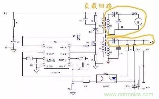 4)負載回路:N3,N4二次繞組及后續(xù)電路,均為負載回路,負載回路的異常,會牽涉到保護回路和穩(wěn)壓回路,使兩個回路做出相應的保護和調整動作。