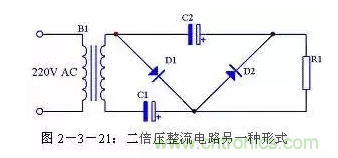 二倍壓整流電路還有另外一種形式的畫(huà)法,見(jiàn)圖2-3-21,其原理與圖2-3-18完全一致,只是表現(xiàn)形式不一樣。