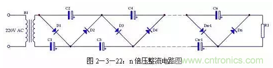 二倍壓電路還可以很容易的擴(kuò)展為n倍壓電路,具體電路見(jiàn)圖2-3-22。