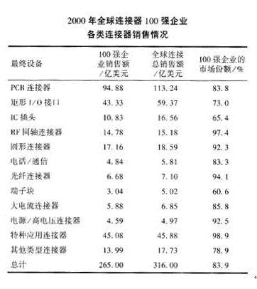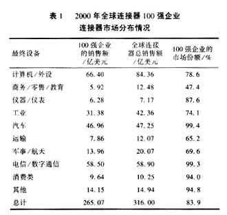 自2001年以來,受“9.11”恐怖事件、網(wǎng)絡(luò)通訊業(yè)泡沫破滅及美國經(jīng)濟低迷的影響,世界連接器市場一度遭受重創(chuàng),2001年的銷售額下降19.1%,但是,軍用連接器市場卻在平穩(wěn)中微增。據(jù)Fleck的研究報告,軍事/航天用連接器2000年的銷售額為20.072億美元,2001年達到20.118億美元,增長0.2%。全球連接器100強企業(yè)占據(jù)了69.1%軍用連接器市場份額,如表1所示。各類軍用連接器也基本上由全球100強企業(yè)所壟斷,如表2所示。