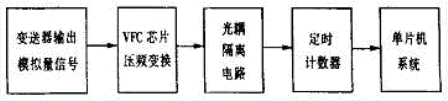 另一種模擬量傳輸?shù)慕鉀Q方法,就是采用VFC(電壓頻率轉(zhuǎn)換)方式,如圖3所示?,F(xiàn)場(chǎng)變送器輸出模擬量信號(hào)(假設(shè)電壓信號(hào)),電壓頻率轉(zhuǎn)換器將變送器送來(lái)的電壓信號(hào)轉(zhuǎn)換成脈沖序列,通過(guò)光耦隔離后送出。在主機(jī)側(cè),通過(guò)一個(gè)頻率電壓轉(zhuǎn)換電路將脈沖序列還原成模擬信號(hào)。此時(shí),相當(dāng)于光耦隔離的是數(shù)字量,可以消除光耦非線性的影響。這是一種有效、簡(jiǎn)單易行的模擬量傳輸方式。