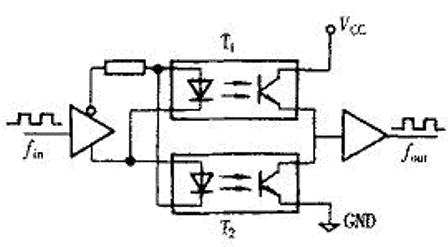 用2只光電耦合器T1,T2接成互補(bǔ)推挽式電路,可以提高光耦的開(kāi)關(guān)速度,如圖5所示。當(dāng)脈沖上升為“1”電平時(shí),T1截止,T2導(dǎo)通。相反,當(dāng)脈沖為“0”電平時(shí),T1導(dǎo)通,T2截止。這種互補(bǔ)推挽式電路的頻率特性大大優(yōu)于單個(gè)光電耦合器的頻率特性。