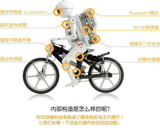 村田制作所在本屆高交會上展示了會騎單車的小機器人——村田頑童,每次演示都吸引了大量觀眾。村田頑童是村田制作所2005年發(fā)布的,至今已經(jīng)3周歲,但是他那精湛的騎單車技術(shù)仍然吸引了眾多觀眾的駐足。