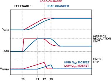 這個(gè)公式假定負(fù)載電流瞬時(shí)從0 A上升到30 A,這是一個(gè)理想情況。實(shí)際上,較大MOSFET的柵極電荷量QGS會(huì)限制柵極電壓的壓擺率,從而限制上電電流,因此,一定量的電荷會(huì)傳輸?shù)截?fù)載電容而不觸發(fā)定時(shí)器功能。在圖4中,具有較大QGS的MOSFET會(huì)導(dǎo)致定時(shí)器的工作時(shí)間短于具有較小QGS的MOSFET,前者為T(mén)1 ~ T3,而后者為T(mén)0 ~ T2。[page]