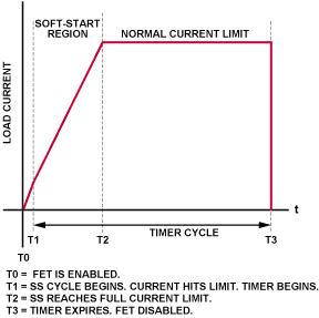 利用軟啟動(dòng),浪涌電流在軟啟電容設(shè)定的期間可以從零線性增加到滿(mǎn)量程。通過(guò)逐步提高基準(zhǔn)電流,能避免浪涌電流突然達(dá)到30 A的限制。需要注意的是,在軟啟過(guò)程中,電流處于調(diào)整過(guò)程中,因此,定時(shí)器從軟啟動(dòng)開(kāi)始之際就進(jìn)入工作狀態(tài),如圖5所示。