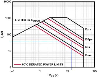 在40 V,降額后的功率所對(duì)應(yīng)的電流為14 A,在SOA圖上這點(diǎn)將確定新的62°C降額后的1 ms線。使用同樣的辦法可確定新的10 ms以及100 μs線。新線在圖6中以紅色示出。