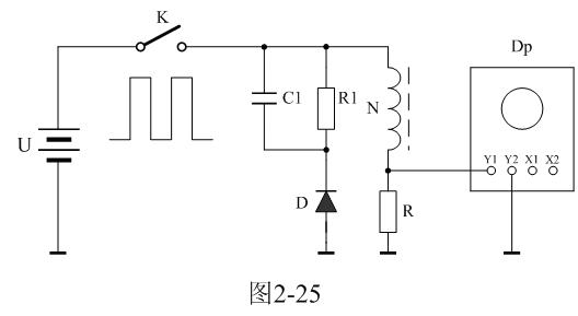 圖2-25中,U是電源電壓,通過控制開關(guān)K不斷地接通和關(guān)斷,就可以把電源電壓調(diào)制成單極性電壓脈沖;N為變壓器初級(jí)線圈,D為反激輸出整流二極管;R1為反激輸出負(fù)載電阻;C1為濾波電容;R為取樣電阻,通過測(cè)量R兩端的電壓,就可以知道流過變壓器初級(jí)線圈的電流;取樣電壓被送到示波器Dp進(jìn)行顯示。