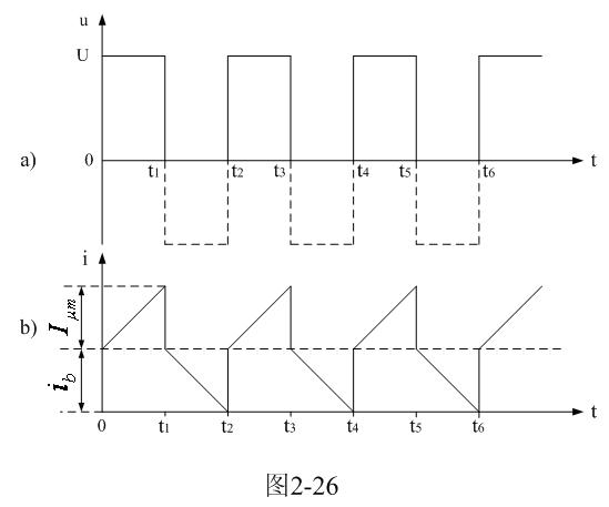 圖2-26是圖2-25電路中變壓器初級(jí)線圈兩端電壓以及電流波形圖。圖2-25中,通過改變控制開關(guān)K的占空系數(shù),可使變壓器初級(jí)線圈正好工作于電流臨界連續(xù)狀態(tài)或電流斷續(xù)狀態(tài),即:流過變壓器初級(jí)線圈中的電流在下一次控制開關(guān)K接通之前為0。