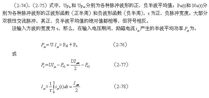 順便指出:(2-84)式的結(jié)果,是認(rèn)為渦流損耗在t1-t2期間(圖2-26-b)完全等于0而求得的,但實(shí)際上,在t1-t2期間變壓器初級(jí)線圈產(chǎn)生的反電動(dòng)勢(shì)同樣也會(huì)在變壓器鐵芯中感應(yīng)產(chǎn)生渦流損耗電流,即當(dāng)輸入電壓為0時(shí)刻,在變壓器鐵芯中還存在很短暫時(shí)間的渦流損耗;由于這種渦流損耗是由反電動(dòng)勢(shì)提供能量來維持的,它將隨著反電動(dòng)勢(shì)能量的衰減很快就衰減到0。