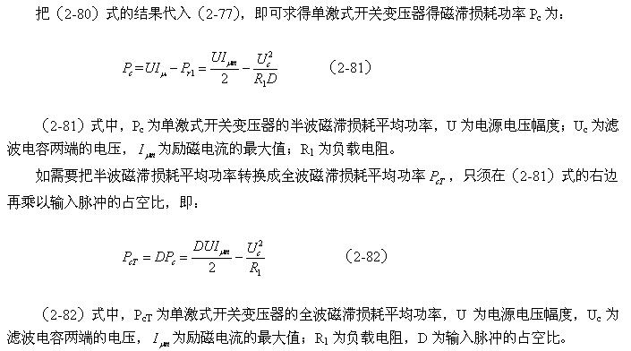 磁滯損耗半波平均功率Pc可根據(jù)(2-76)式或(2-77)式求得,不過在求Pc時(shí),還須先求反激輸出電壓在負(fù)載電阻R1上的半波平均功率Pr1;而計(jì)算反激輸出電壓在負(fù)載電阻R1上的半波平均功率Pr1時(shí),還得先求反激輸出電壓在負(fù)載電阻R1上的全波平均值Pra;而全波平均值Pra就是反激輸出電壓在負(fù)載電阻R1上損耗的功率。