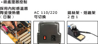 采用精密CPU數(shù)位控溫電路, 和日本進(jìn)口陶瓷發(fā)熱體, 精準(zhǔn)控制溫度200~480ºC, 整體防靜電結(jié)構(gòu), 輸入電壓AC 110V/220V可切換, 配合安全回路保護(hù), 流線可堆疊外型, 開(kāi)關(guān)前置、斜面無(wú)視角差, 適合各種環(huán)境使用焊臺(tái)、烙鐵架分離設(shè)計(jì), 并具有錫絲架功能、使用便利.