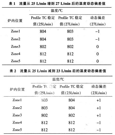 (4)手動調(diào)節(jié)大N2流量,從25L/min,減少到23L/min,記錄流量調(diào)節(jié)前后穩(wěn)定溫度值和流量變化導(dǎo)致的溫度動態(tài)偏差值,見表2,表中Zone1為爐尾,Zone2是爐中尾,Zone3為爐中,Zone4是爐中口,Zone5為爐口。