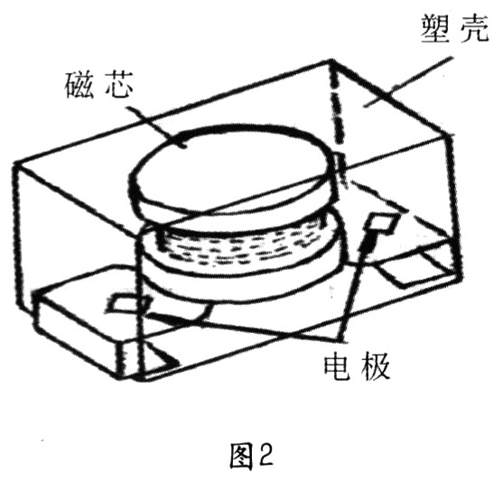 另一種形式的片式電感器是片式繞線電感器,這是對(duì)傳統(tǒng)繞線型電感器的一種改進(jìn),采用微小型工字型磁芯,經(jīng)繞線、焊接、電極成型、塑封等工序制成,見圖2。這種類型的片式電感生產(chǎn)工藝簡(jiǎn)單,電性能優(yōu)良(電感量大,品質(zhì)因素高),適合于大電流通過(guò),可靠性好。但受磁芯尺寸和制造工藝限制,進(jìn)一步微小型有困難。