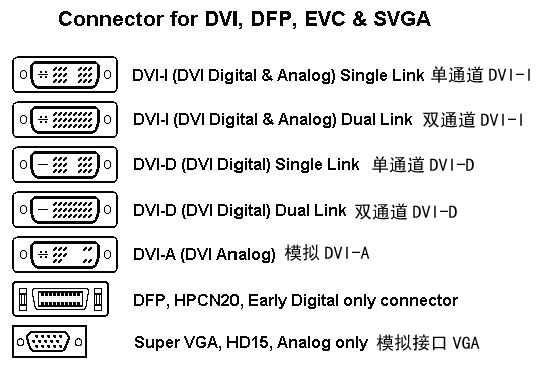 DVI-A是一種模擬傳輸標(biāo)準(zhǔn),晚期的大屏幕專業(yè)CRT中能看見。不過由于和VGA沒有本質(zhì)區(qū)別,性能也不高,因此DVI-A事實上已經(jīng)被廢棄了。至于DFP接口,這是一種已經(jīng)被廢棄的早期的數(shù)字規(guī)范。