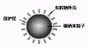 由于納米粒子表面呈活性,為防止其自身凝聚必須要做表面控制。我們所用的納米粒子是平均直徑為10nm左右的銀納米粒子,其表面用有機(jī)物保護(hù)層進(jìn)行了涂覆。圖3為有機(jī)物—銀復(fù)合納米粒子的掃描電鏡圖像,圖4為其結(jié)構(gòu)模式圖。