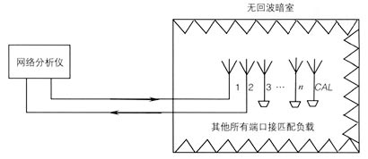 (3)將測(cè)量系統(tǒng)與被測(cè)天線的校準(zhǔn)端口和第i個(gè)饋電端口相連接,被測(cè)天線的其余端口一律接匹配負(fù)載,在工作頻率范圍內(nèi)進(jìn)行傳輸系數(shù)S(i,CAL)的測(cè)量;