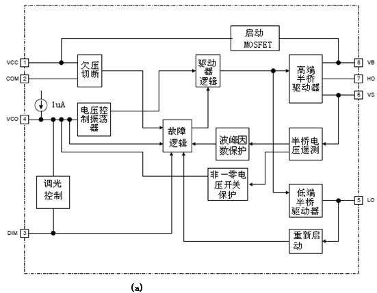 IRS2530D和IRS2158D為600V控制IC。IRS2530DDIM8是一種采用緊湊型8管腳尺寸半橋式驅(qū)動(dòng)器的線性調(diào)光鎮(zhèn)流器控制IC。它只需要幾個(gè)小型外部元件,顯著地簡化和縮小了電路設(shè)計(jì),同時(shí)可實(shí)現(xiàn)10%的調(diào)光系統(tǒng)性能。圖3(a)為引腳功能示意圖。[page]