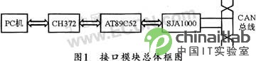 本文所介紹的USB-CAN轉(zhuǎn)接技術(shù)總體框圖如圖1所示,該設(shè)計分兩大部分:一是與主機(jī)USB接口相連的USB控制部分;二是與CAN總線相連的CAN控制器部分。兩者中間通過單片機(jī)聯(lián)系起來。USB控制部分用USB接口控制芯片CH372來實現(xiàn)數(shù)據(jù)的接收和發(fā)送;CAN控制器SJA1000用來實現(xiàn)CAN總線間的數(shù)據(jù)通信。單片機(jī)用來進(jìn)行相應(yīng)的控制、協(xié)調(diào)以及系統(tǒng)的通信。