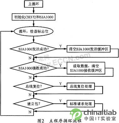 單片機(jī)AT89C52在系統(tǒng)中主要起到一個橋梁和協(xié)調(diào)控制的作用。主機(jī)通過CH372把數(shù)據(jù)發(fā)送到單片機(jī),單片機(jī)再把數(shù)據(jù)通過SJA1000發(fā)送到CAN總線,從而實現(xiàn)整個系統(tǒng)的通信。此外,單片機(jī)還需要對CH372和SJA1000進(jìn)行初始化,并通過地址/數(shù)據(jù)以復(fù)用的方式訪問CH372和SJA1000。由于在訪問其中一個芯片時,如果另一個芯片還保持有輸出,那么單片機(jī)就不能讀到正確的數(shù)據(jù),因此,單片機(jī)要通過片選控制信號分配有效地址。單片機(jī)主要通過主循環(huán)來監(jiān)控系統(tǒng)的通信,其主循環(huán)流程圖見圖2所示。[page]