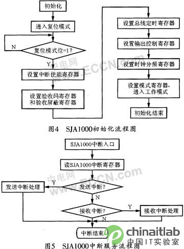 在CAN總線端,單片機(jī)控制著傳輸流程。SJA1000的初始化由單片機(jī)完成,其初始化流程圖見圖4所示,在正常工作模式下,單片機(jī)可控制SJA1000的收發(fā)等操作,以完成和CAN總線的通信。當(dāng)主機(jī)端傳來數(shù)據(jù)時,單片機(jī)將數(shù)據(jù)轉(zhuǎn)發(fā)到SJA1000的發(fā)送緩沖區(qū),并由SJA1000根據(jù)CAN協(xié)議自動封裝后發(fā)送到CAN總線上;當(dāng)SJA1000接收到來自CAN總線上的一個有效的報文后,系統(tǒng)將在INT引腳上產(chǎn)生一個硬件中斷信號(低有效),當(dāng)單片機(jī)收到中斷信號后,即進(jìn)人中斷服務(wù)程序,以完成數(shù)據(jù)的接收和處理,其中斷服務(wù)流程見圖5所示。