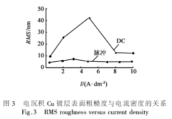 圖3為脈沖電鍍與直流電鍍電沉積Cu鍍層表面粗糙度RMS(rootmeansquare)與電流密度的關(guān)系??梢?jiàn)脈沖所得鍍層表面粗糙度僅為幾個(gè)納米,而直流所得鍍層表面粗糙度在10nm以上,最大時(shí)甚至達(dá)到了40nm,這樣大的粗糙度將為后續(xù)CMP工藝造成極大的困難。而平整的表面可以為CMP工藝提供一個(gè)易于進(jìn)行處理的基底表面,采用脈沖電鍍Cu鍍層的表面粗糙度RMS比直流電鍍的低。