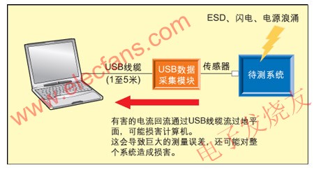 圖2:未隔離的USB數(shù)據(jù)采集模塊在ESD、閃電、電源浪涌的時候可能損害系統(tǒng)并導致數(shù)據(jù)不正確。