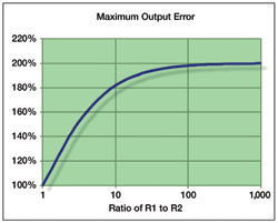 如果R1和R2的阻值不同,那么電壓輸出的誤差將逼近固有的電阻容差的兩倍,如圖3所示。分壓器設(shè)計(jì)的最壞情況出現(xiàn)在兩個(gè)電阻的容差正好相反時(shí)。如果分壓器的設(shè)計(jì)采用了容差為±0.1%的電阻,那么在此比率下輸出誤差最壞可達(dá)±0.2%。