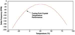 溫度的不穩(wěn)定和相應(yīng)的溫度系數(shù)是許多應(yīng)用所面臨的問題,特別是那些工作在寬溫范圍的應(yīng)用,如室外電表或水表。標(biāo)準(zhǔn)的用作RTC時(shí)基的32.768kHz音叉晶體的頻率響應(yīng)與溫度之間的關(guān)系為Δf/f=k(T-T0)2+f0。其中,Δf為頻率偏差,f為基頻,k為曲率,T為溫度,T0為折點(diǎn)溫度,f0為折點(diǎn)溫度處的頻偏。