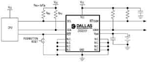 如圖5所示,典型的DS3231應(yīng)用電路內(nèi)部集成了晶體,其他電路類似于普通RTC,設(shè)計(jì)人員無須考慮分立晶體的選擇和布板。因?yàn)镈S3231包含經(jīng)過溫度補(bǔ)償校準(zhǔn)的振蕩器,可顯著提高RTC的初始精度和溫度穩(wěn)定性。由于內(nèi)嵌在封裝內(nèi)的晶體已經(jīng)經(jīng)過高溫老化處理,DS3231與分立的晶體相比具有更好的長(zhǎng)期穩(wěn)定性。精度可以達(dá)到±2×10-6,溫度范圍0~+40℃。