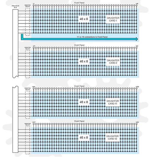 主子板卡決定了Y軸的尺寸,而其他子板卡只是擴(kuò)展了X軸上的點數(shù)。每個子板卡在Y軸尺寸上必須和主子板卡相同,根據(jù)不同版本的BRIC選擇其他不同的子板卡。BRIC在Y軸尺寸上有4,8,16這幾種標(biāo)準(zhǔn)尺寸,要想獲得其他的尺寸就需要減少板卡上的繼電器數(shù)量即可。除了一個柱上開關(guān)外,可以提供的還有屏蔽的和2個柱上開關(guān)的矩陣形式。