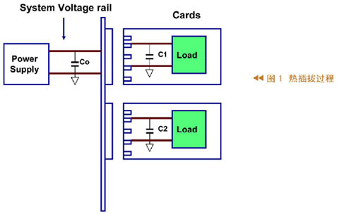 圖1所示為熱插拔過(guò)程,其中左邊代表系統(tǒng)及其供電,在供電的輸出端有一個(gè)電容,右側(cè)有兩張卡,這些卡的輸入端也有電容。把卡插入系統(tǒng)之前,輸入電容沒(méi)有被充電;當(dāng)把卡插入系統(tǒng)時(shí)會(huì)有一個(gè)很大的瞬間電流向輸入電容充電,這么大的瞬時(shí)電流很可能造成系統(tǒng)供電電壓不正常。