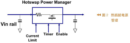 熱插拔的實(shí)現(xiàn)如圖2所示,是通過(guò)在供電與負(fù)載之間串聯(lián)一個(gè)MOS管和一個(gè)電流檢測(cè)電阻完成的。電流檢測(cè)電阻的目的是將流過(guò)MOS管的信號(hào)傳給控制線路,控制線路再根據(jù)電流設(shè)定和計(jì)時(shí)電路來(lái)控制MOS管的導(dǎo)通。