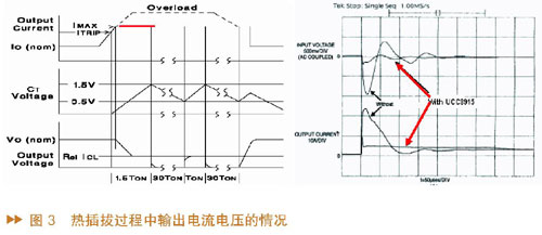 接下來(lái)以UCC3915為例說(shuō)明熱插拔過(guò)程中輸出電流電壓的情況。圖3中,左邊圖形是UCC3915的輸出電流、輸出電壓、即時(shí)電容電壓的波形,可以看到當(dāng)輸出電流上升到ITRIP時(shí),計(jì)時(shí)電容開(kāi)始充電,電壓上升,開(kāi)始計(jì)時(shí);如果輸出電流超過(guò)ITRIP并一直上升到IMAX(設(shè)定的最大值),由于此時(shí)MOS管工作在線性模式,將最大輸出電流限制在這一水平而不讓輸出電流上升,因此輸出電流就會(huì)被限制在IMAX。