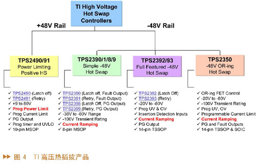 對(duì)于高壓熱插拔產(chǎn)品,又可以分為兩類(lèi):+48V產(chǎn)品和?48V產(chǎn)品,如圖4所示。48V的產(chǎn)品有TPS2490和2491,這個(gè)產(chǎn)品的工作電壓從9V到80V,含有一個(gè)獨(dú)特的功能叫做定功率的設(shè)定。?48V的熱插拔控制芯片,包括TPS2390、2391、2398和99,這個(gè)系列針對(duì)簡(jiǎn)單的熱插拔的應(yīng)用,工作電壓從?36到?80V,是8只腳的封裝。第二個(gè)48V的熱插拔是TPS2392和TPS2393,是屬于全功能?48V的熱插拔產(chǎn)品,除了擁有TPS2390系列的所有功能之外,也含有欠壓和過(guò)壓的設(shè)定,提供兩只腳做連接器的檢測(cè)。
