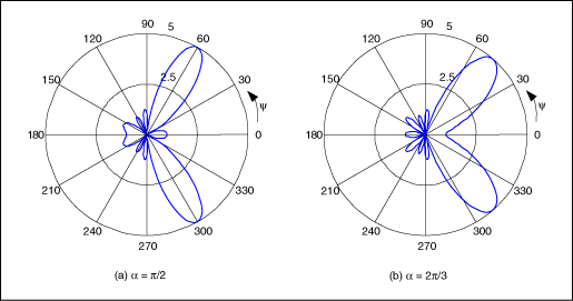 除了改變波瓣的寬度,通過對連續(xù)單個天線的信號設(shè)定固定的相位延遲α(圖3),還可以實現(xiàn)主波瓣在x–y平面內(nèi)的旋轉(zhuǎn)。天線陣列的輻射圖正比于天線陣列系數(shù)F(u):