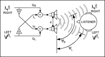 當聆聽兩個揚聲器發(fā)出的聲音時,左聲道的聲音先到達左耳,后到達右耳;右聲道的聲音先到達右耳,后到達左耳。右耳聽到較低音量的左聲道信號,左耳聽到較低音量的右聲道信號。這種效應(yīng)稱為音頻串擾(圖1)。
