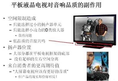 他指出要設(shè)計(jì)好的電視音響則需要有好的揚(yáng)聲器單元、大的電視機(jī)空間(便于散熱)、更好的揚(yáng)聲器空間分離(實(shí)現(xiàn)雙聲道立體聲效果)、對(duì)低頻補(bǔ)償,但是看看現(xiàn)在平板電視,基本是否定了這些要素:例如LCD-TV在采用LED背光后變的更薄、很多液晶電視的音箱放置于電視底端造成空間分離不明顯、由于電視變薄散熱問題加劇廠商把音頻輸出功率降低,所有這一切造成了了一個(gè)后果:電視機(jī)屏幕越大聽覺體驗(yàn)越差!