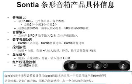 Sontia的業(yè)務(wù)模型比較有特點(diǎn),也采用授權(quán)模式,主要模式是Sontia授權(quán)其3-聲道條形音箱參考設(shè)計(jì),Sontia為OEM提供了一個(gè)可以直接生產(chǎn)的完整套裝,或者采用預(yù)付版權(quán)費(fèi)以及與銷售量有關(guān)的版權(quán)費(fèi)模式,Sontia未來的產(chǎn)品走向?qū)⑾蚋叨藯l形音箱參考設(shè)計(jì)、便攜式多媒體播放器的底座(iPod)以及Sontia的數(shù)字音頻處理技術(shù)直接嵌入到電視里中的軟件解決方案發(fā)展。