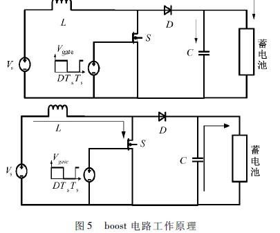 boost工作電路如圖5所示,根據(jù)電感L伏秒平衡和電容C充放電能量守恒有: